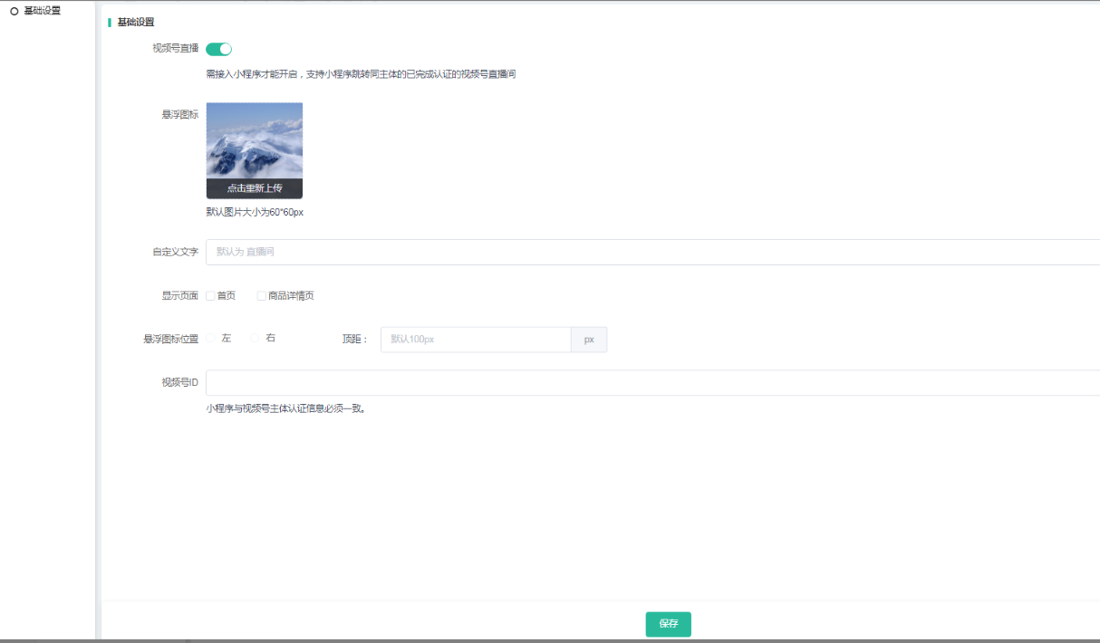 1.后台--系统--应用进入视频号直播间插件,基础设置中可设置视频号直播间的悬浮窗口在首页和商品详情页面显示、自定义悬浮图标图片、自定义文字、悬浮图标位置