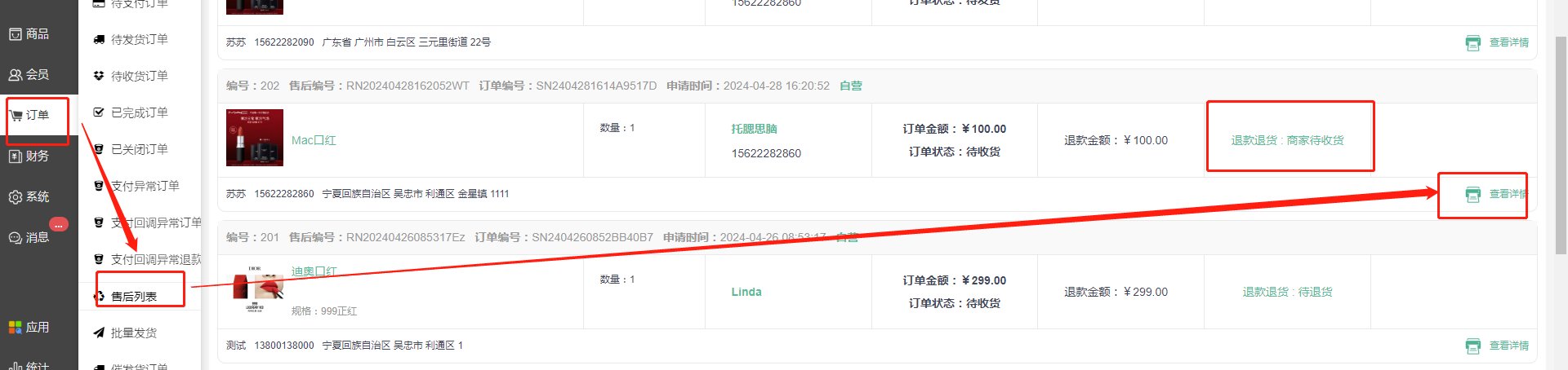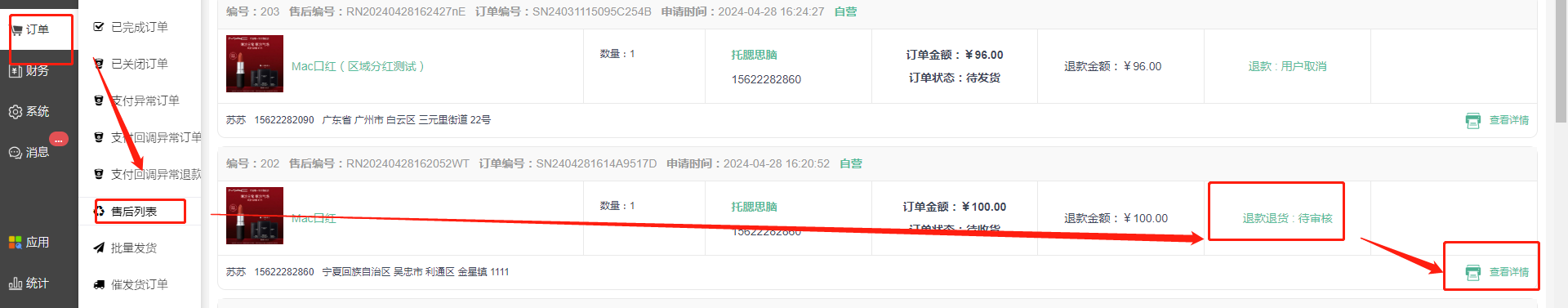 后台--订单--售后列表--找到需要审核的订单(该笔订单退款退货)--点击查看详情,如下图所示: