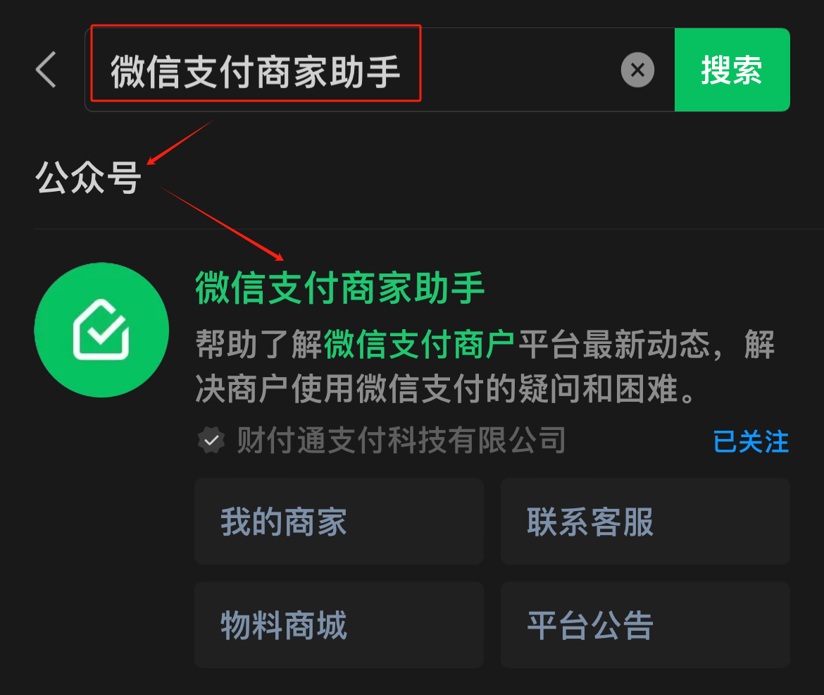微信搜索微信支付商家助手,选择公众号的微信支付商家助手进行关注