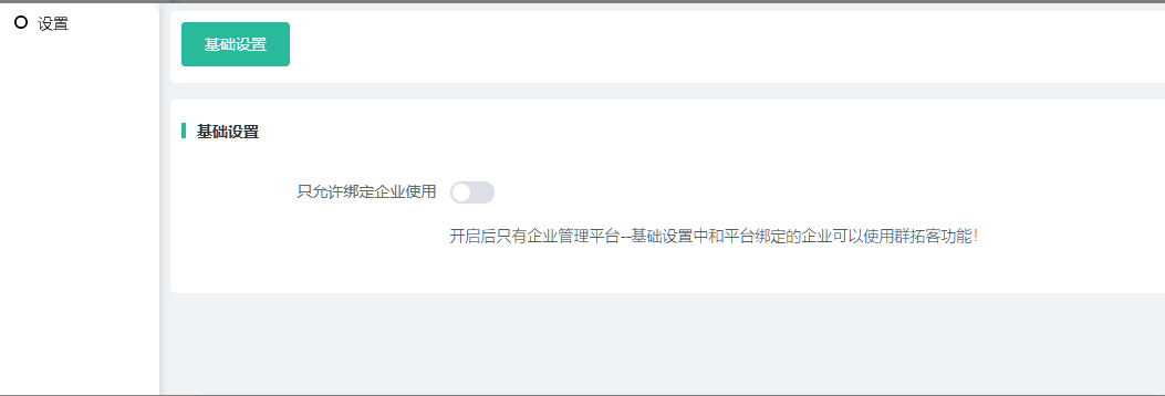 2、后台--应用--群拓客如果开启后只有企业管理平台--基础设置中和平台绑定的企业可以使用群拓客功能!