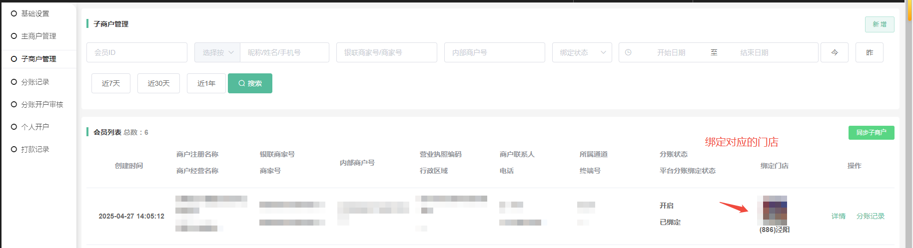 绑定对应的门店,如果绑定的状态显示未绑定,点击右边的同步子商户的按钮即可