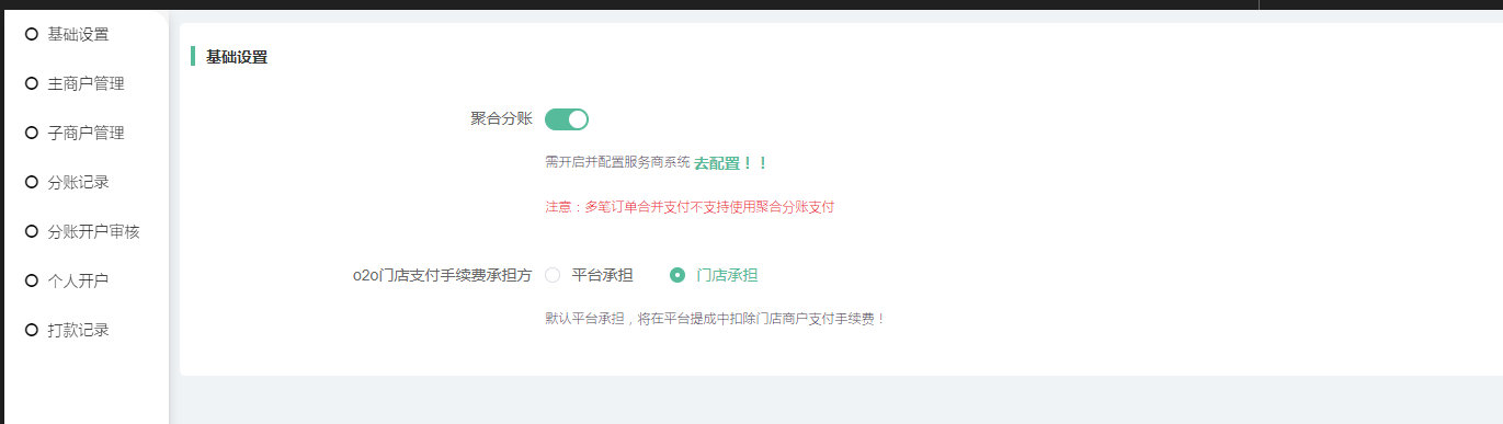 ⑹以上都操作完毕之后,到门店收银台,进行门店分账的设置,如果每个门店的平台抽佣比例不一样,可以单门店设置抽佣比例,需要分别设置线下线上的抽佣比例,开启微信聚合和微信--聚合分账(线上也是一样的操作)